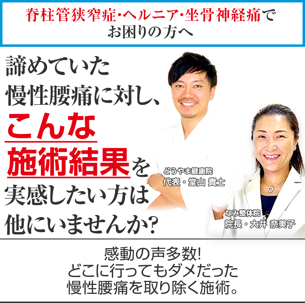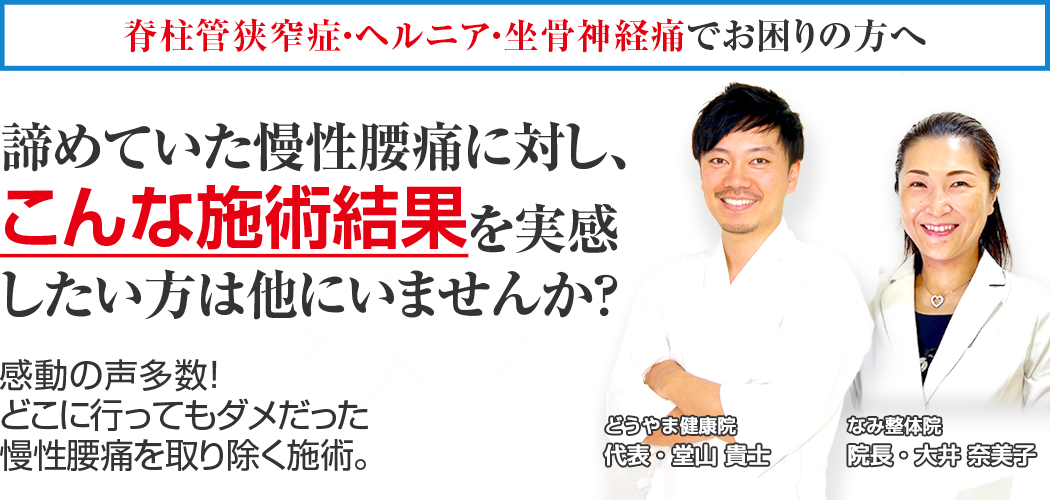 これまでに一万5千人以上の改善成果を持ち、最先端の腰痛施術技術、数多くの慢性腰痛の患者様から支持され、あなたの症状に真正面から向き合ってくれる野洲市で唯一の慢性腰痛専門院 なみ整体院に来院し、もう二度とその痛みに我慢することのない人生を手に入れる道。